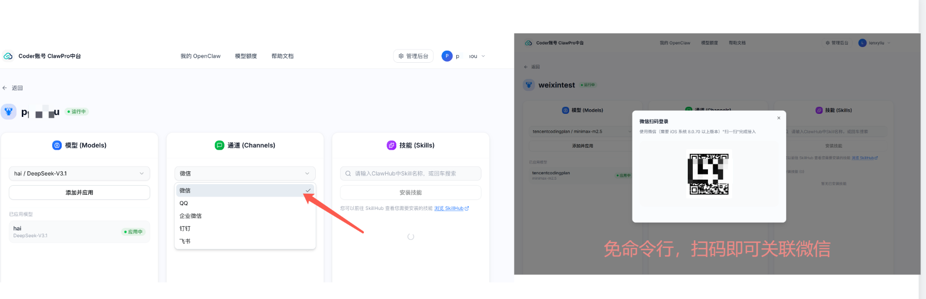前往员工端,点击一键创建“新虾”,直接进入教程步骤三绑微信