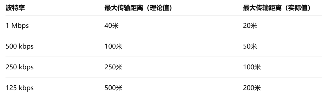 在汽车电子中,CAN总线的传输距离通常远小于理论最大值。以下是几个实际应用中的参考值: