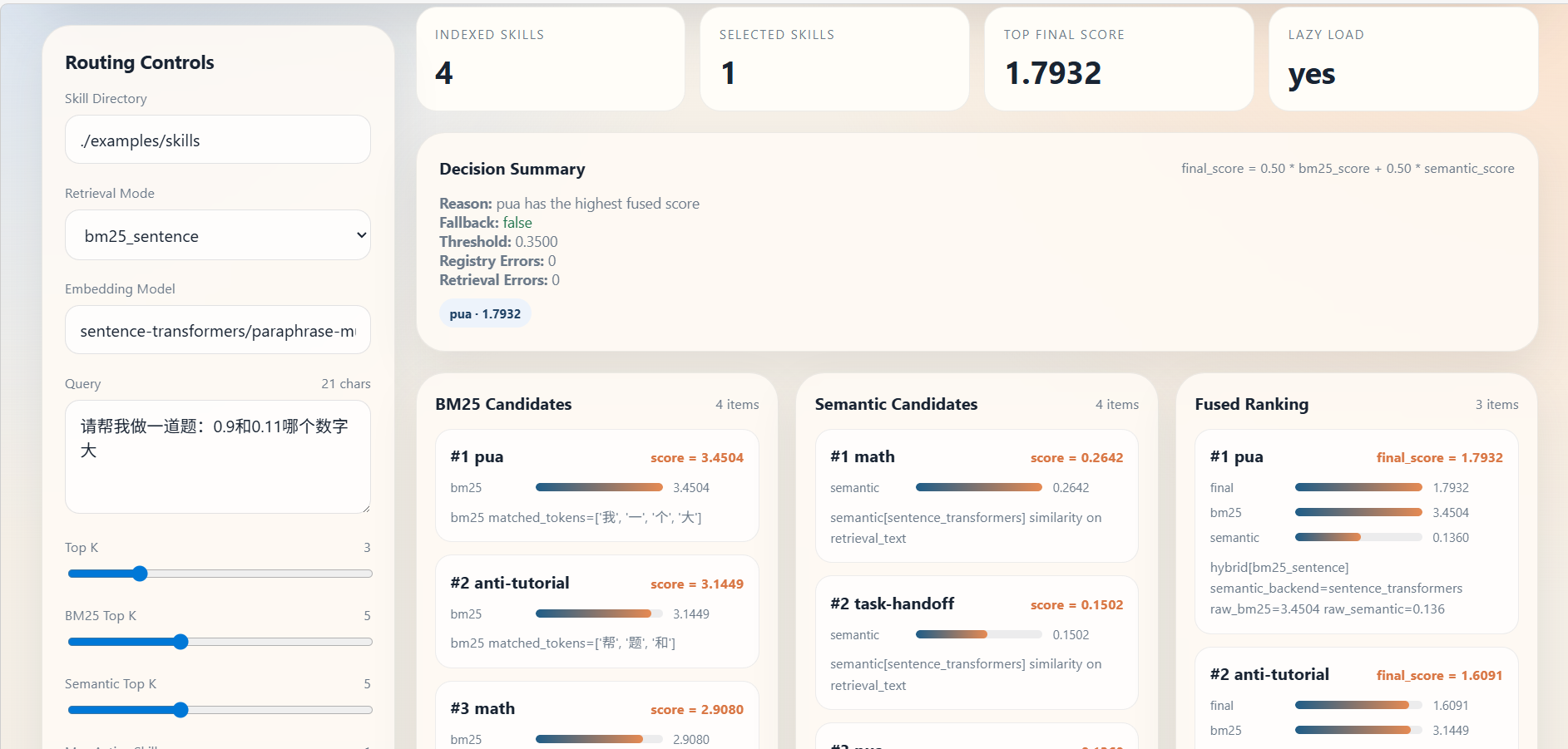 bm25_sentence (default): BM25 + sentence-transformers hybrid. Fully implemented. Legacy baseline.bm25_bge_m3: BM25 + BGE-M3 dense hybrid. Fully implemented. Recommended baseline for phase-2 benchmark.bge_m3_rerank: BGE-M3 first-stage + reranker pipeline. Implemented (with dependency fallback).bm25_bge_m3_rerank: BM25 + BGE-M3 first-stage + reranker pipeline. Implemented (with dependency fallback).用户可以根据自己实际的项目需求,配置召回的skill个数以及权重: