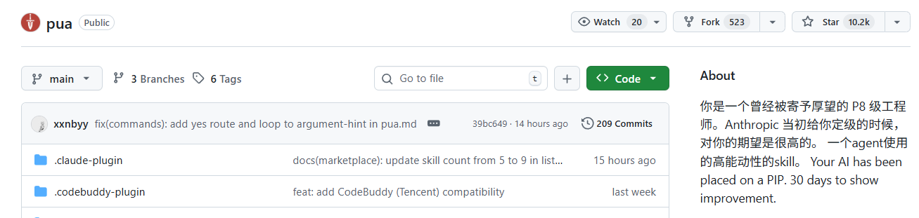 例如当前很火的pua, 该项目已经达到了10k ⭐