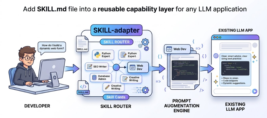 )当我们有了SKILL-adapter之后呢,它通过用户 Query → Skill Routing → Skill 选择 → Prompt Augmentation → 现有 LLM 应用的流程,以低侵入的方式直接接入ai应用中