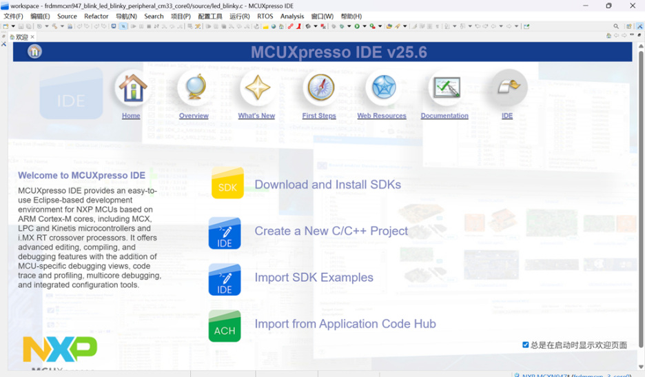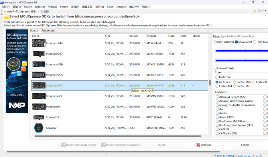 通过IDE内置的SDK管理器,用户可快速检索并安装FRDM-MCXN947对应的SDK版本,且该SDK完全免费开放。SDK安装完成后,即可开展项目创建或示例工程导入操作。
