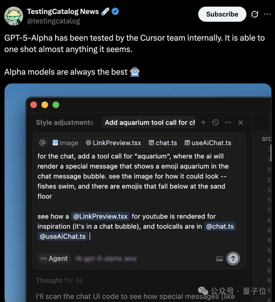 同时也有人发现,cursor团队正在内部测试GPT-5 Alpha版本(图中被模糊掉的部分原来标了GPT-5-Alpha)。