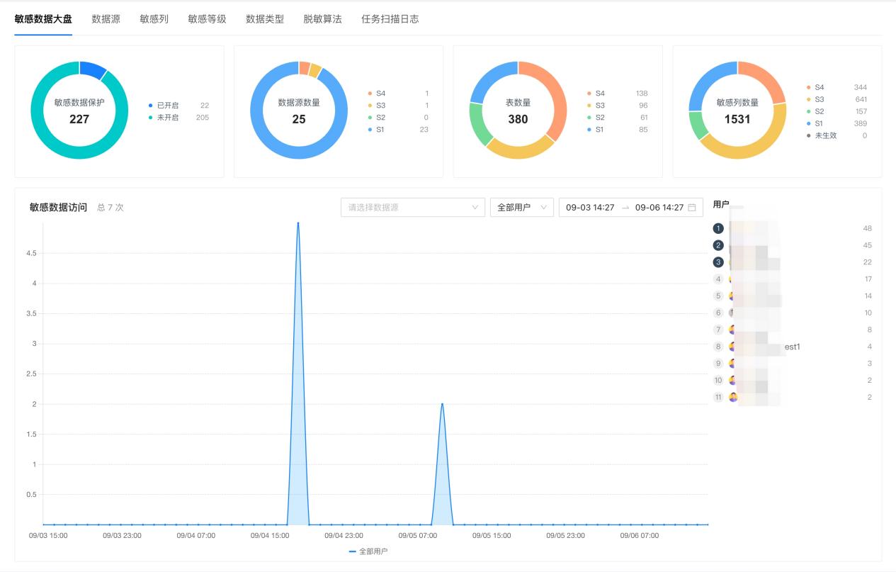 此外,NineData 提供的敏感数据大盘功能,展示当前组织下敏感数据相关信息,包含支持敏感数据保护的数据源总数、已开启敏感数据的数据源总数以及敏感级别、已开启敏感数据的表的总数、敏感列的总数、敏感数据访问次数等,管理员可以更直观地了解企业数据库中敏感数据的整体情况。