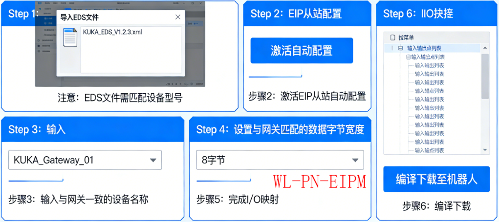 答:导入库卡EDS文件,激活EIP从站自动配置,输入与网关一致的设备名称,设与网关匹配的数据字节宽度,完成I/O映射后编译下载至机器人。