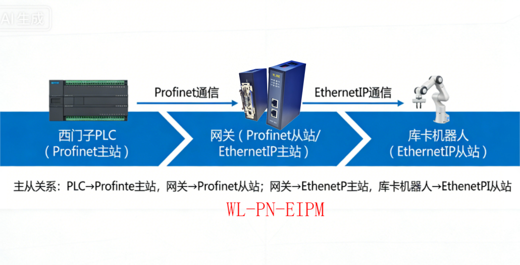 答:通过Profinet转Ethernet IP网关实现西门子PLC与库卡机器人跨协议通信。主从关系:PLC是Profinet主站、网关是Profinet从站,网关是Ethernet IP主站、库卡机器人是Ethernet IP从站。