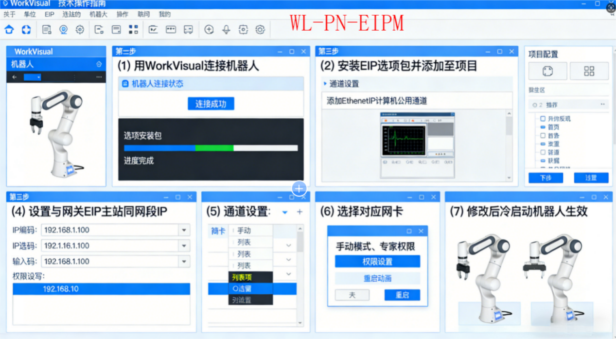 答:用WorkVisual连接机器人,安装EIP选项包并添加至项目;添加Ethernet IP总线,设与Profinet转Ethernet IP网关EIP主站同网段IP,选对应网卡。