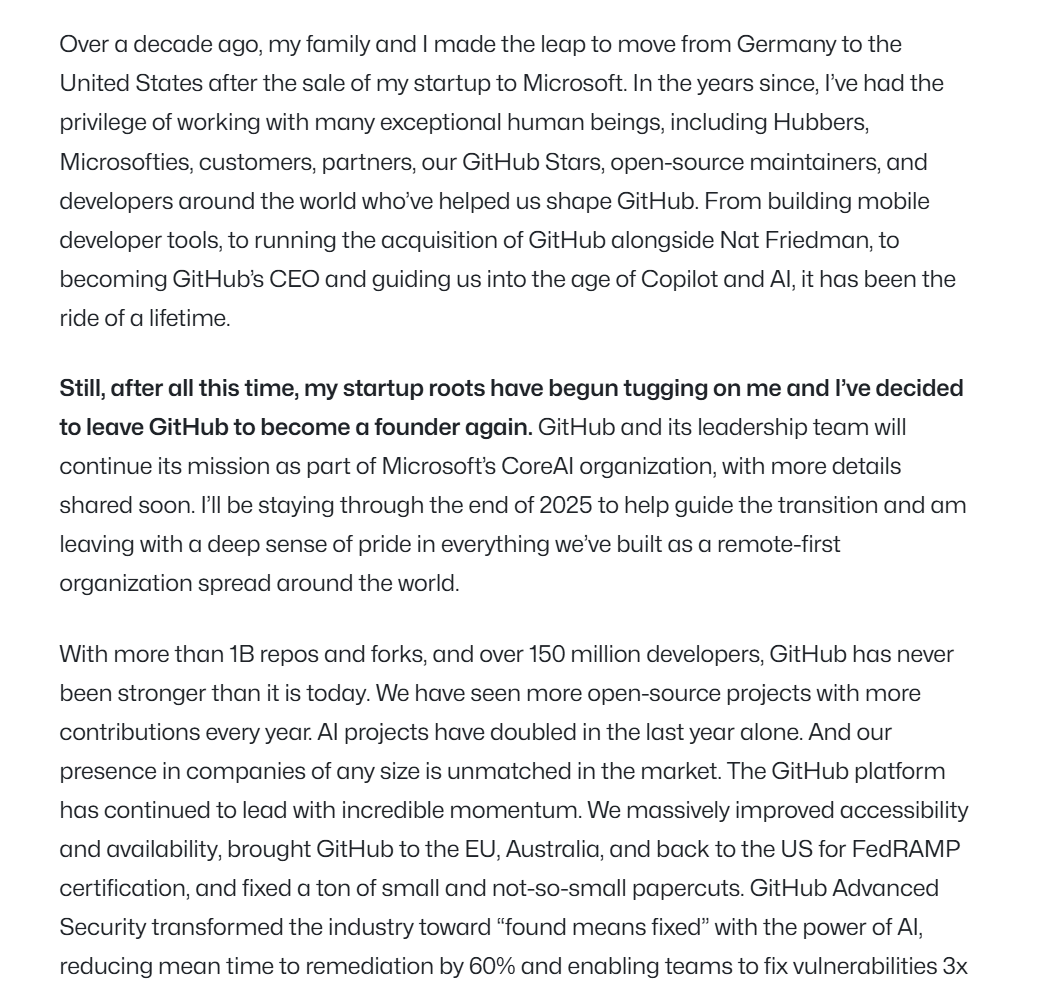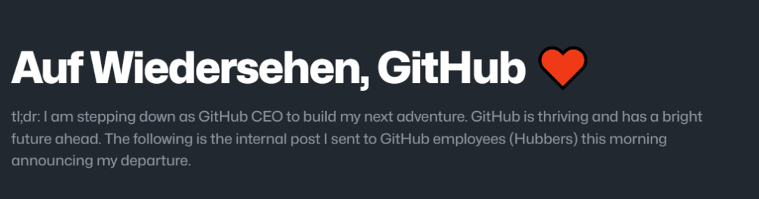 2025年8月11日GitHub CEO Thomas Dohmke宣布,他将在年底离职,重返创业。