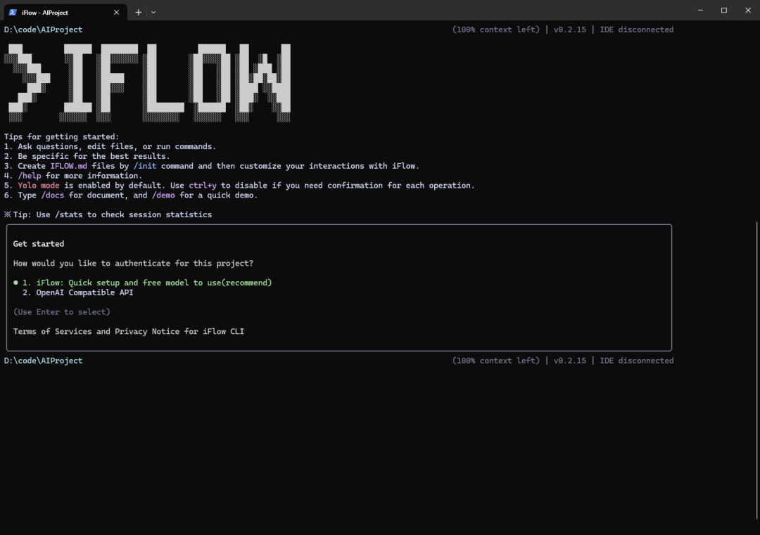 iflow 启动工具,首次启动时会弹出 “输入 API 密钥” 的提示。iFlow CLI 内置了多种模型,用户可根据需求选择: