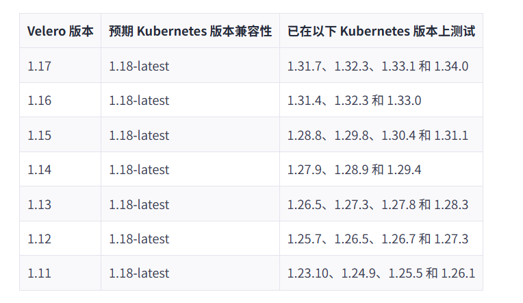 Velero 与 Kubernetes 版本需匹配,例如 Velero v1.17.0 支持 Kubernetes v1.24+。建议参考官方兼容性矩阵(https://velero.io/docs/v1.8/compatibility/)。