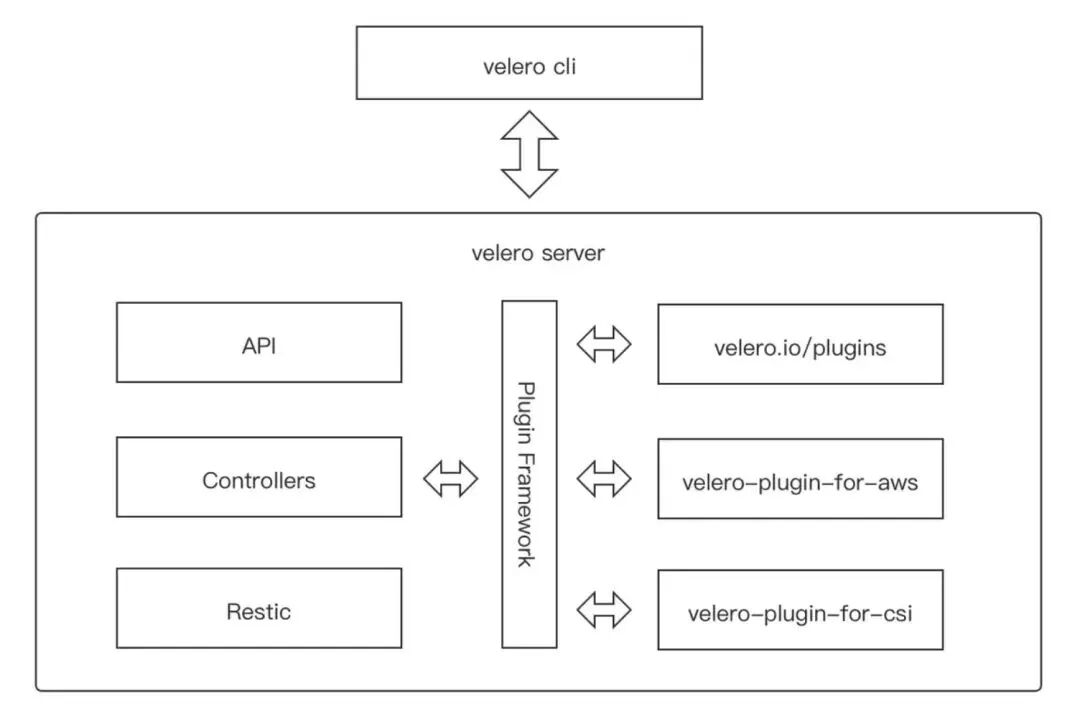Velero 的架构主要由客户端工具、服务端组件和插件系统三大部分构成。Velero 的组件间通过 Kubernetes API 进行通信,采用事件驱动的架构模式。