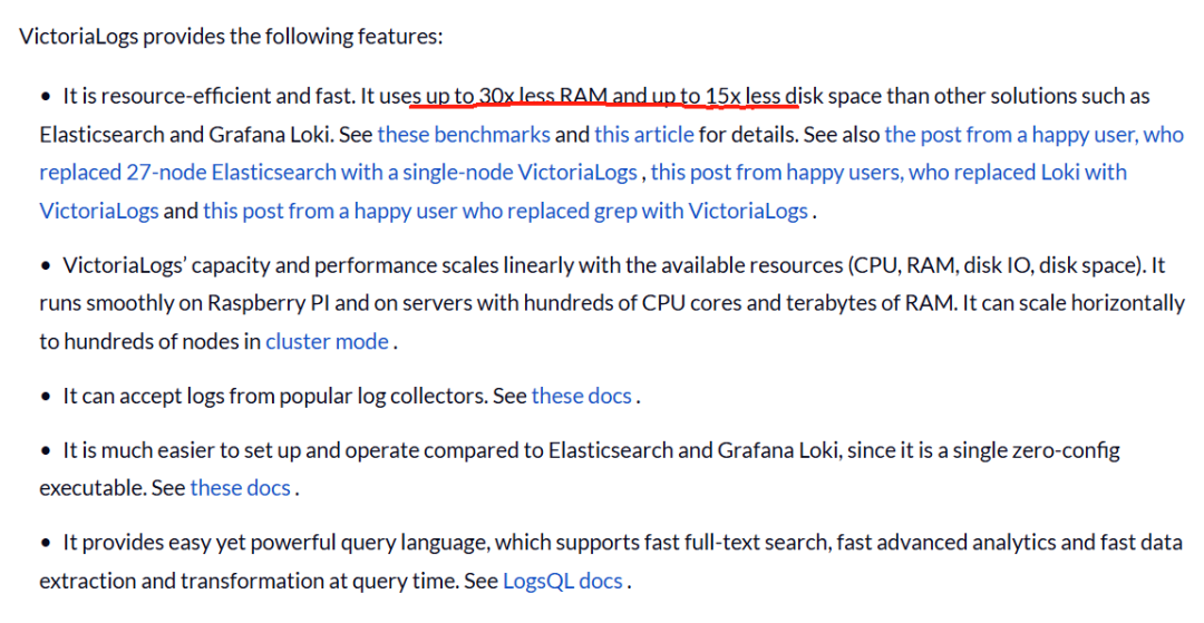 资源占用极低:相比 Elasticsearch,RAM 使用量低 30 倍,磁盘空间占用少 15 倍,单节点可处理数百 TB 日志。