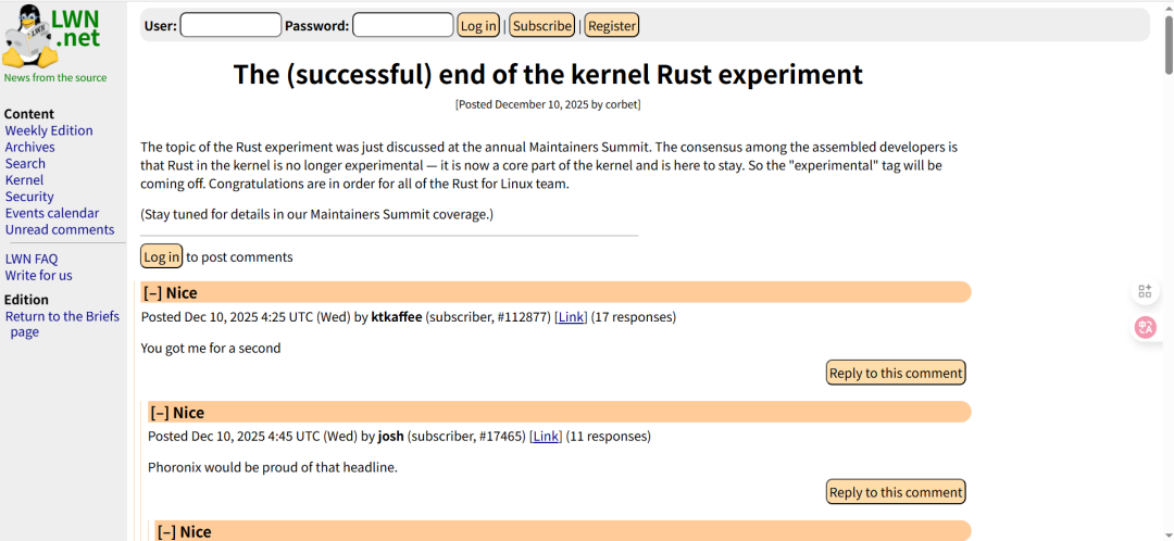 2025年12月Linux年度维护者峰会上,开发者达成共识,确认Rust已从实验性质转为内核核心组成部分。其“实验性”标识将被移除,并作为长期支持技术方向持续演进。