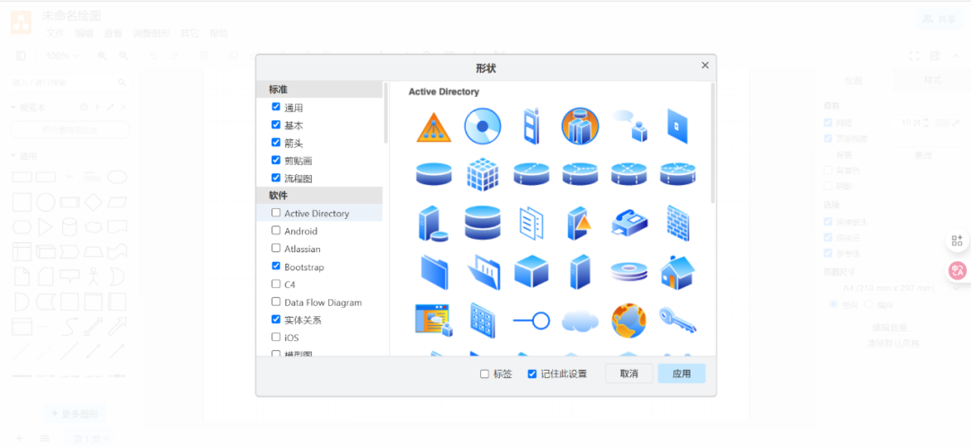预设图形库:涵盖流程图、UML、ER 图、网络拓扑、电路图等 200+ 种形状,支持自定义图形导入。