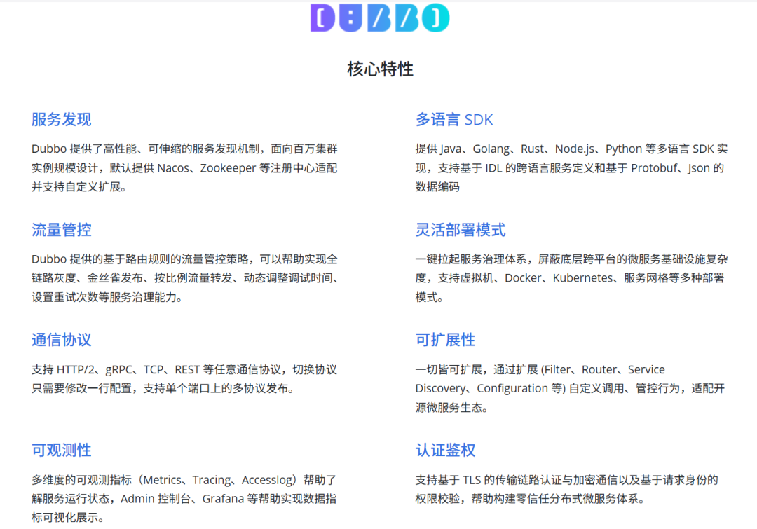 Dubbo是一款高性能、轻量级的开源Java RPC框架,提供面向接口的远程方法调用、智能容错和负载均衡,以及服务自动注册和发现等功能。