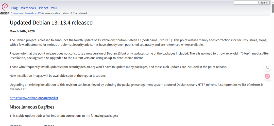 近日,Debian 项目团队正式发布 Debian 13.4,这也是 Debian 13 稳定版系列的第四次维护更新。