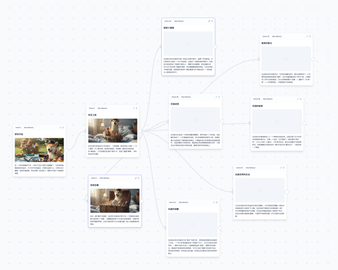 用户可以在画布上自由地缩放、平移画布,还可以拖动每个场景卡片到任意位置。