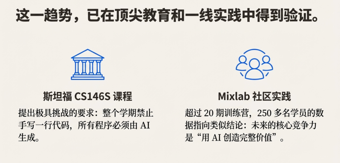 在我们 Mixlab 社区过去 20 多期的实践中,250 多名学员的数据也指向类似的结论:在 AI 时代,单纯的“编写代码能力”正迅速贬值,未来的核心竞争力是“用 AI 创造完整价值”。