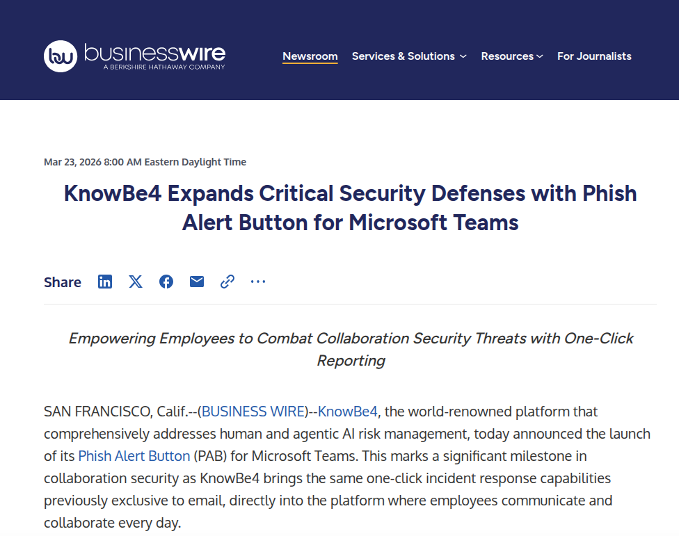 随着网络攻击边界的不断泛化,协作平台已成为继电子邮件之后又一关键的安全战场。KnowBe4将钓鱼警报按钮扩展至Microsoft Teams,不仅是产品功能的延伸,更是对现代网络安全防御理念的一次深刻实践。它证明了在日益复杂的威胁环境下,技术防御与人类智慧的深度融合是构建韧性安全体系的必由之路。