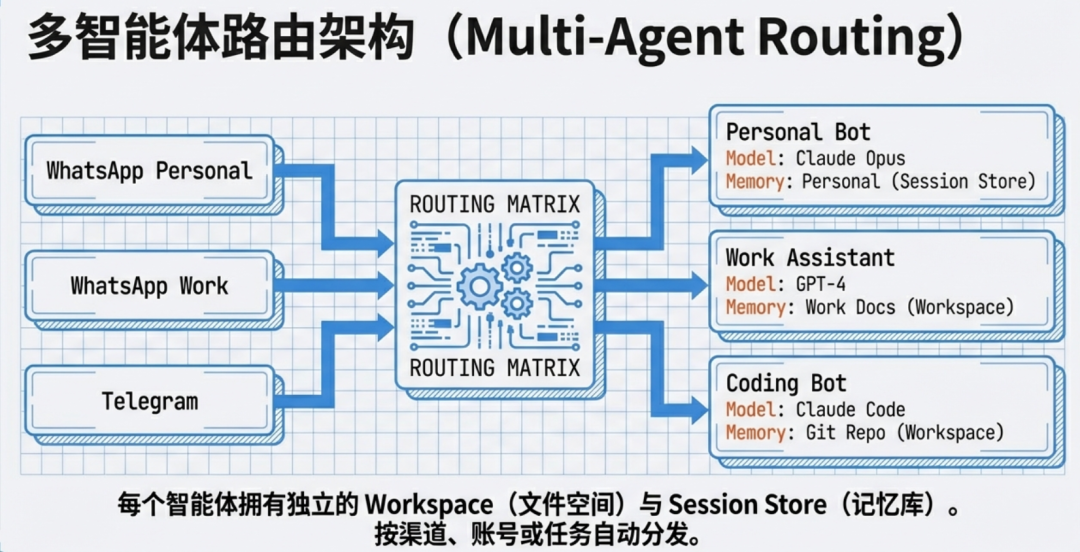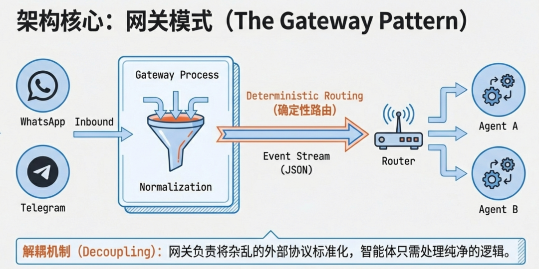它像是一个数字世界的核心,将来自 WhatsApp、Telegram、Discord 的异构消息,统一“归一化”为标准的 JSON 事件流。Maltbot 引入了“网关模式”,将 WhatsApp、Telegram 等异构消息统一归一化为标准的 JSON 事件流。这使得 Agent 能够脱离复杂的 API 文档,进入纯粹的逻辑处理层。