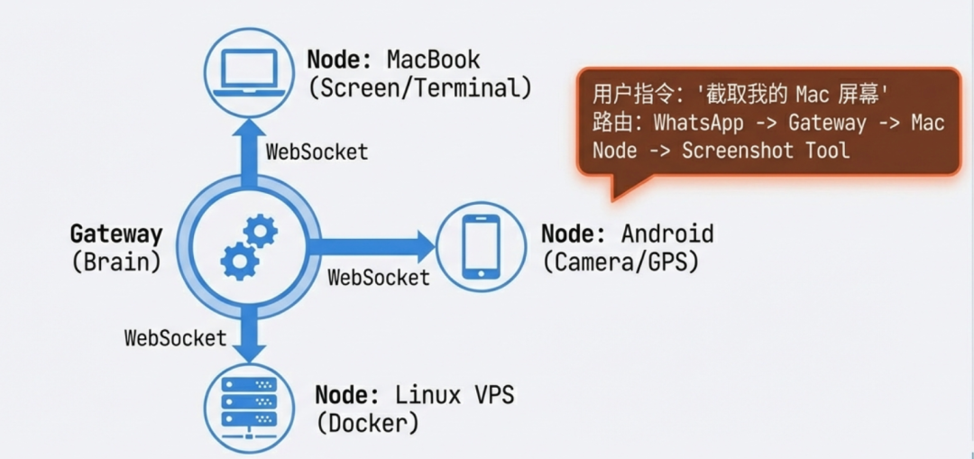 在 Maltbot 的设计中,网关(大脑)通过 WebSocket 长连接,控制着分布在各处的节点(Nodes):