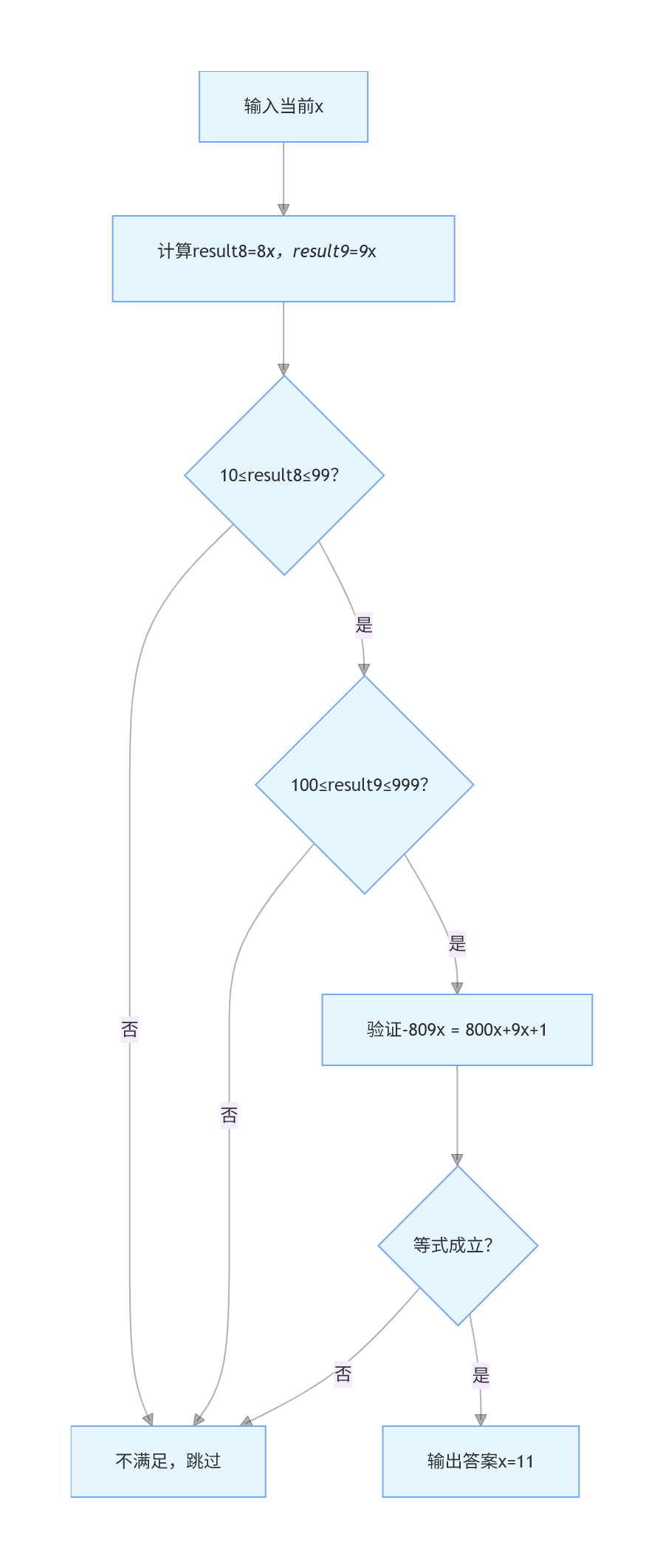 }8 * x 和 9 * x:分别存储在 product8 和 product9 中。8 * x 的结果必须是两位数(10 到 99)。9 * x 的结果必须是三位数(100 到 999)。-809 * x 和 800 * x + 9 * x + 1,如果两者相等,则输出结果。运行这段代码,你将找到符合条件的两位数 x 及其对应的 -809 * x 的结果。