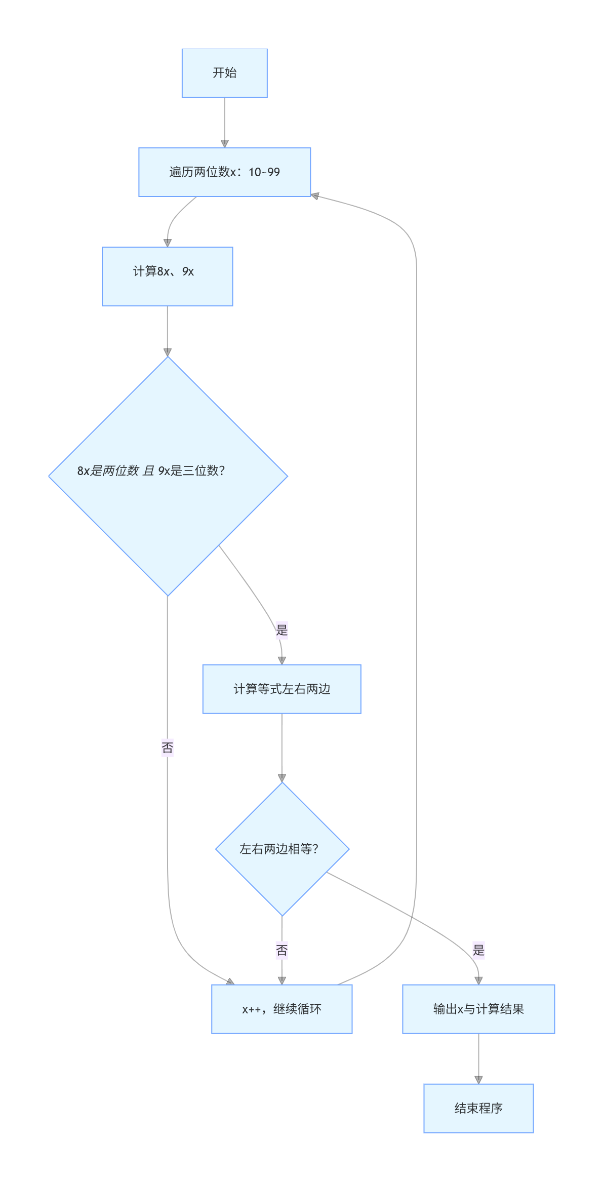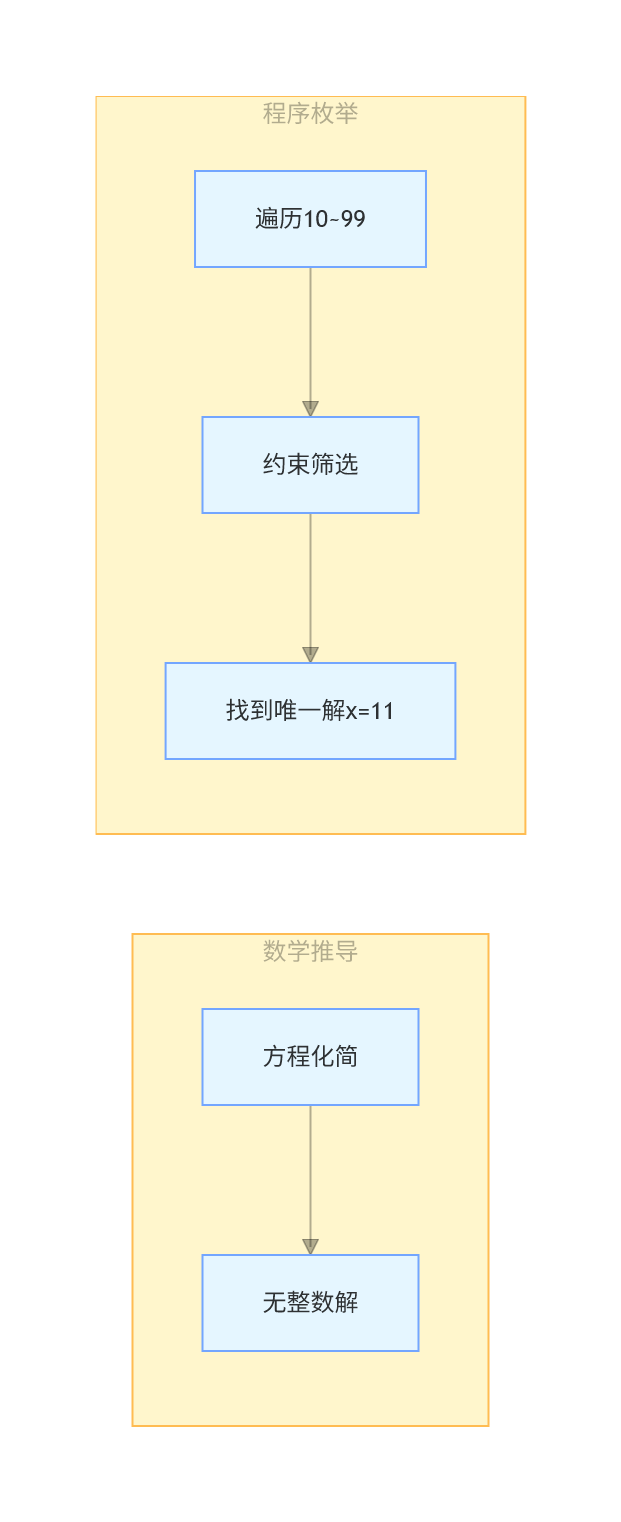 8 * x 的结果是两位数。9 * x 的结果是三位数。我们可以通过编程来遍历所有可能的两位数 x,并检查这些条件是否满足。