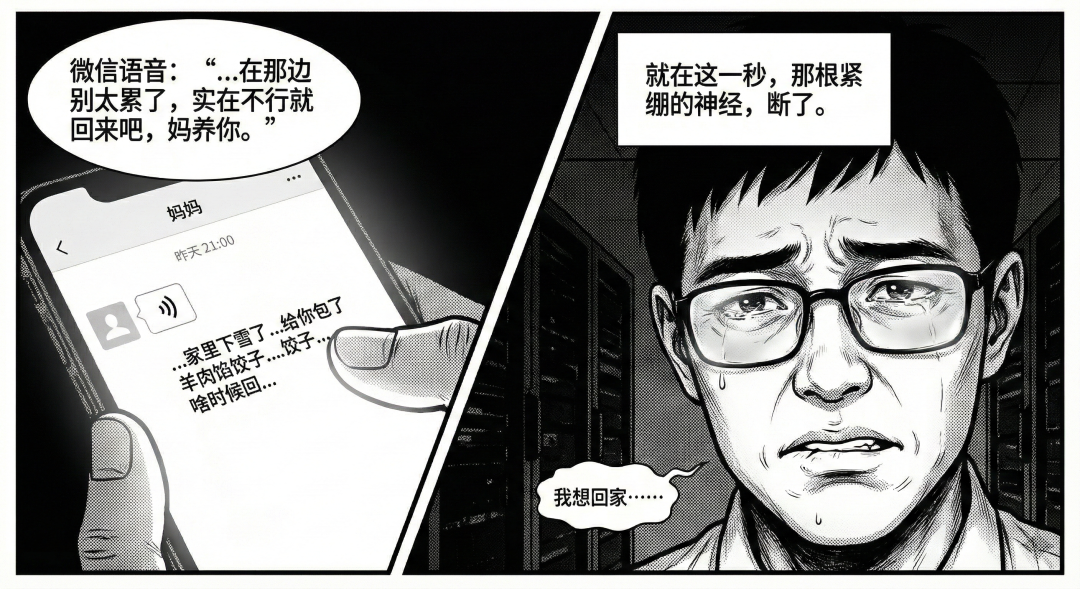 镜片瞬间被雾气蒙住。他死死咬住嘴唇,不敢发出声音。在偌大的数据中心里,他像个孩子一样在心里无声地呐喊:“我想回家……”
