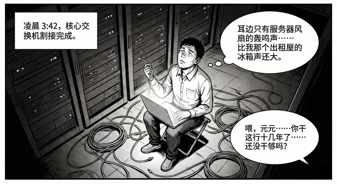 身边的恒温空调和服务器风扇正在全速运转,发出的低频轰鸣声像是一层厚厚的隔音棉,把世界隔绝在外。元元坐在一张摇摇欲坠的折叠凳上,周围是盘根错节的彩色网线,像极了他此刻理不清的人生。