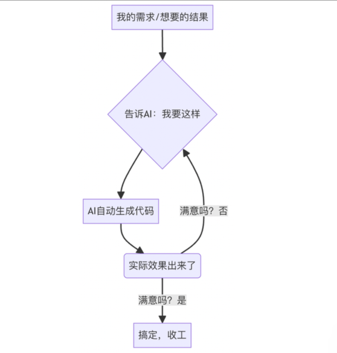 我直接说结论:Vibe Coding 压根就不关心你代码具体怎么实现的,核心关注点是代码生成的结果对不对。至于实现逻辑、底层细节这些繁琐的活,都交给 AI 去搞定。我只需要盯着效果,觉得哪里不对、哪里有问题,就直接改 prompt,重新提需求,AI 会自动帮你调整和优化,直到最后结果完全符合你的预期为止。整个过程你都沉浸在 “说想法—>看结果—>继续调整—>再出结果” 的循环里,效率高得飞起。