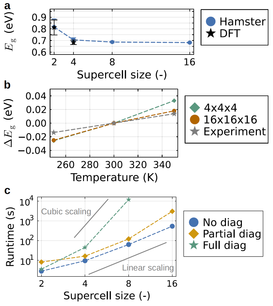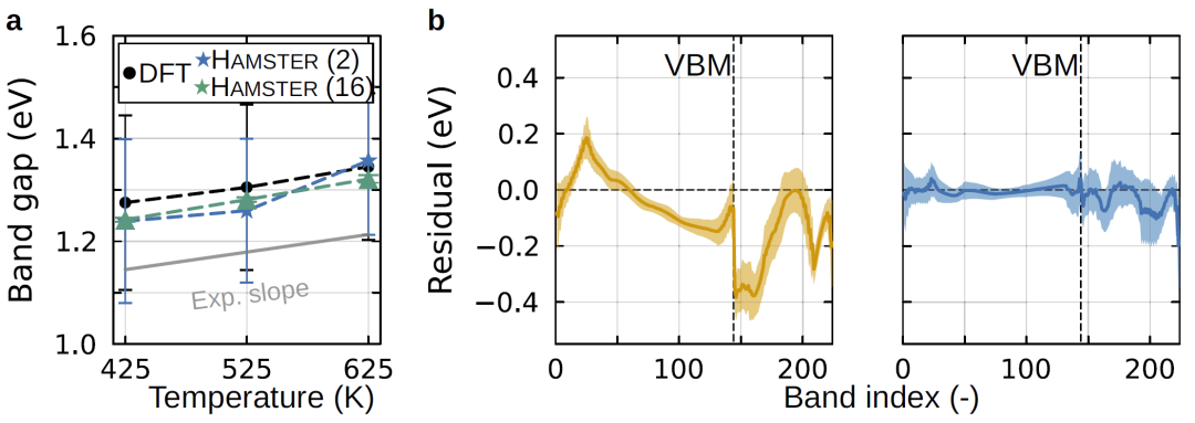 在分子动力学轨迹上计算电子结构时,模型能够捕捉温度变化对带隙的影响,并与实验结果一致。相比传统方法,该框架可以在更大的体系中进行计算,并保持较高精度。