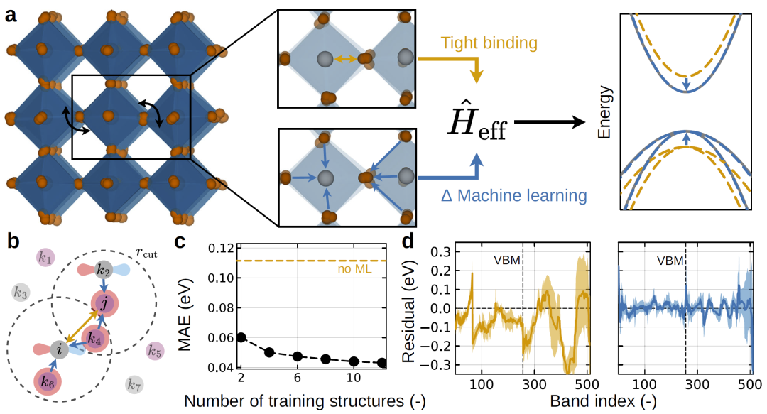 模型输入为原子结构及其局部环境,通过等变神经网络预测哈密顿矩阵的修正项,使结果满足对称性要求。由于模型建立在物理近似之上,因此只需要少量第一性原理数据即可训练完成。