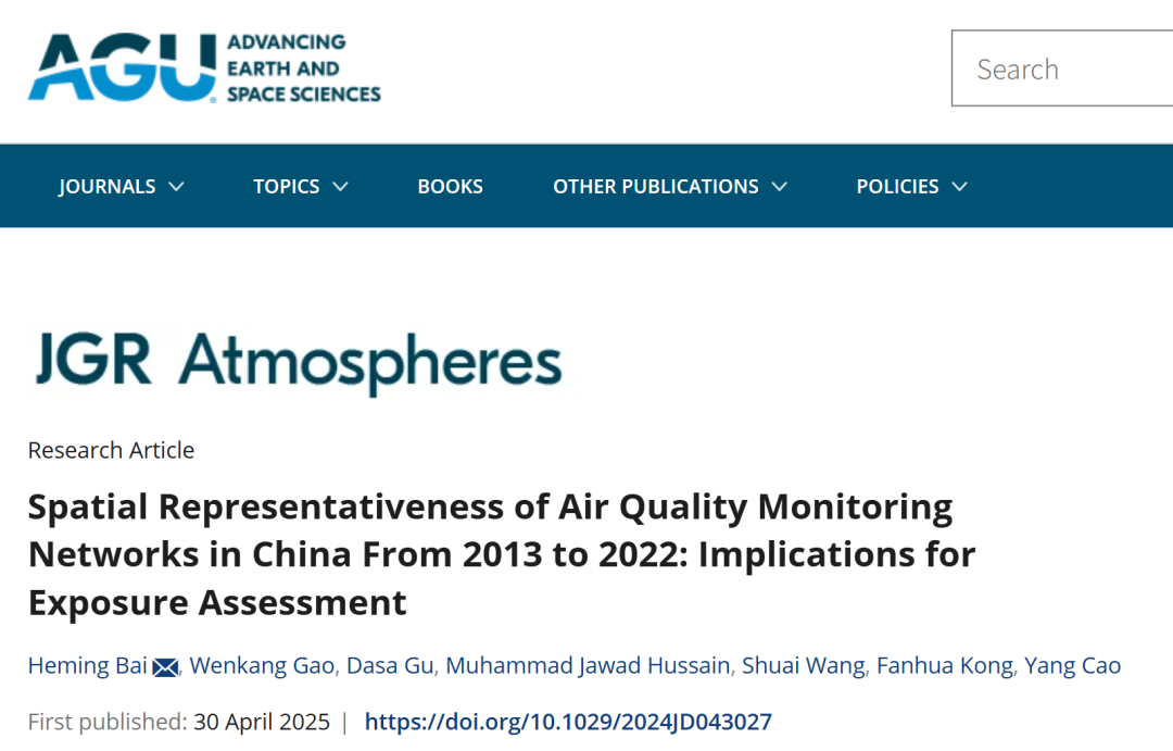 Bai, H., Gao, W., Gu, D., Hussain, M. J., Wang, S., Kong, F., & Cao, Y. (2025). Spatial representativeness of air quality monitoring networks in China from 2013 to 2022: Implications for exposure assessment. Journal of Geophysical Research: Atmospheres, 130, e2024JD043027. https://doi.org/10.1029/2024JD043027.
