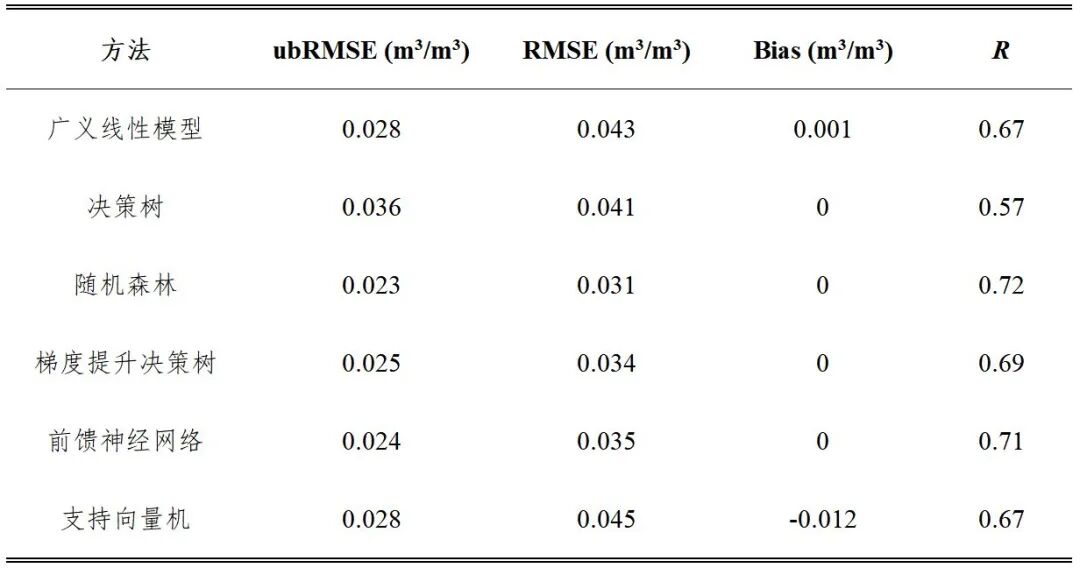 研究团队采用了六种常用的机器学习方法,包括广义线性模型、决策树、随机森林、梯度提升决策树、前馈神经网络和支持向量机。针对ESA CCI卫星土壤水分产品,使用2018年数据构建填补模型,填补2019年数据,并使用2019年原始未缺失数据进行精度验证(表1)。根据精度结果选择表现最优的随机森林、梯度提升决策树和前馈神经网络作为Stacking中涉及机器学习的三个基模型。