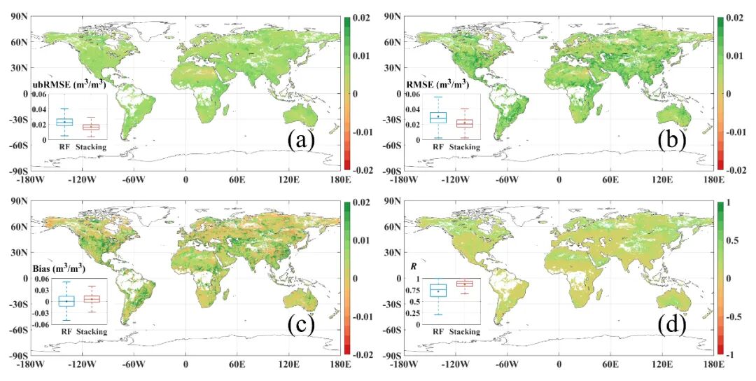 图5 Stacking相对随机森林填补的精度差异全球分布图:(a) ubRMSE (RF-Stacking, m3/m3), (b) RMSE (RF-Stacking, m3/m3), (c) Bias (|RF|-Stacking|, m3/m3), and (d) R (Stacking-RF)