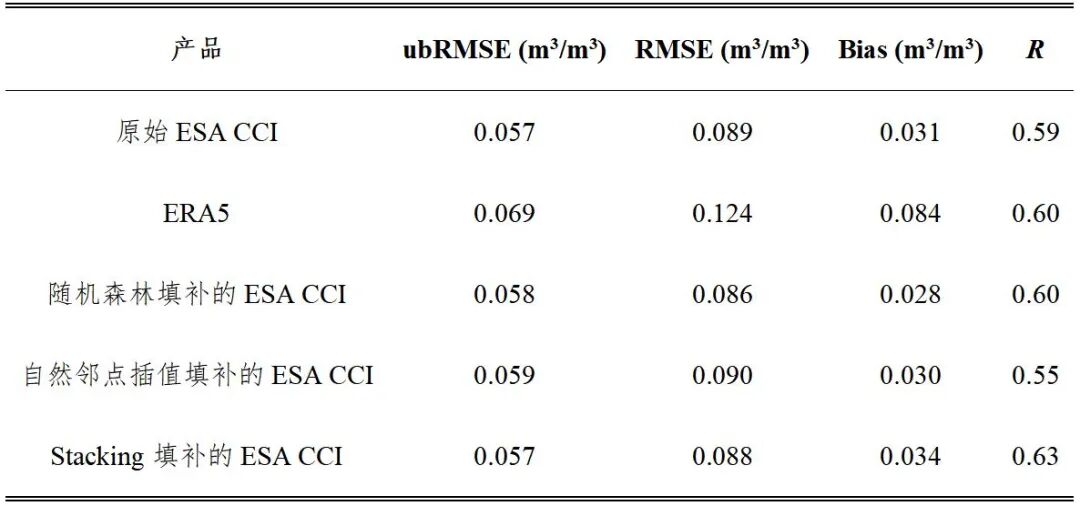 表1 机器学习法填补的ESA CCI土壤水分相对于原始ESA CCI土壤水分的误差指标统计结果
