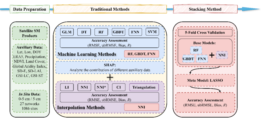 研究成果以“Synergizing Machine Learning and Interpolation Methods: A Stacking Framework for Global-Scale Satellite Soil Moisture Gap Filling”为题,近期已发表于遥感领域国际学术期刊《Remote Sensing of Environment》(中国科学院一区Top)。空天院硕士生荣家明为第一作者,曾江源为通讯作者。研究工作得到国家自然科学优秀青年科学基金、中国科学院青年创新促进会优秀会员、空天院自主部署等项目资助。