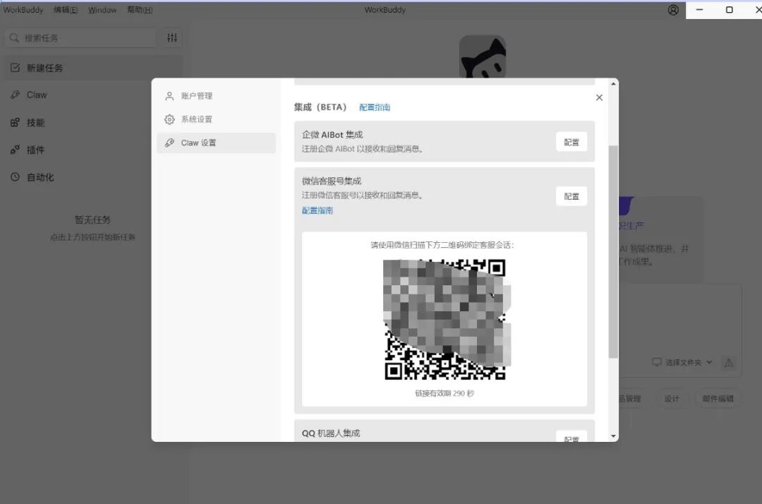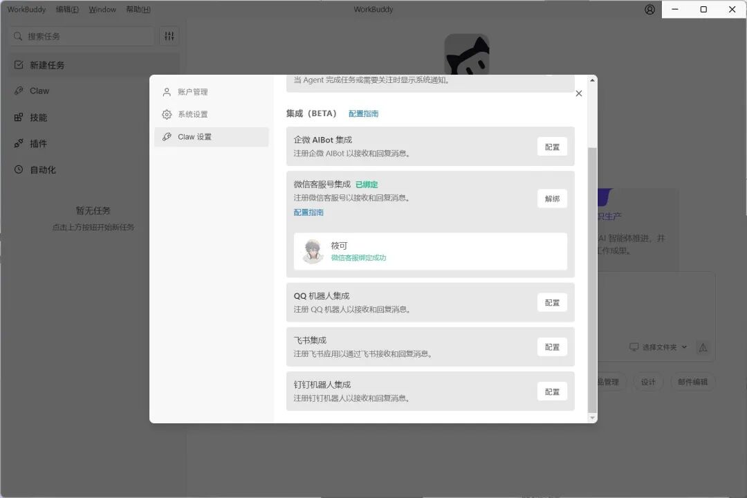 回到 WorkBuddy,点击右上角的头像,进入「Claw 设置」。在集成列表中找到“微信客服号集成”,点击右侧的“配置”按钮。