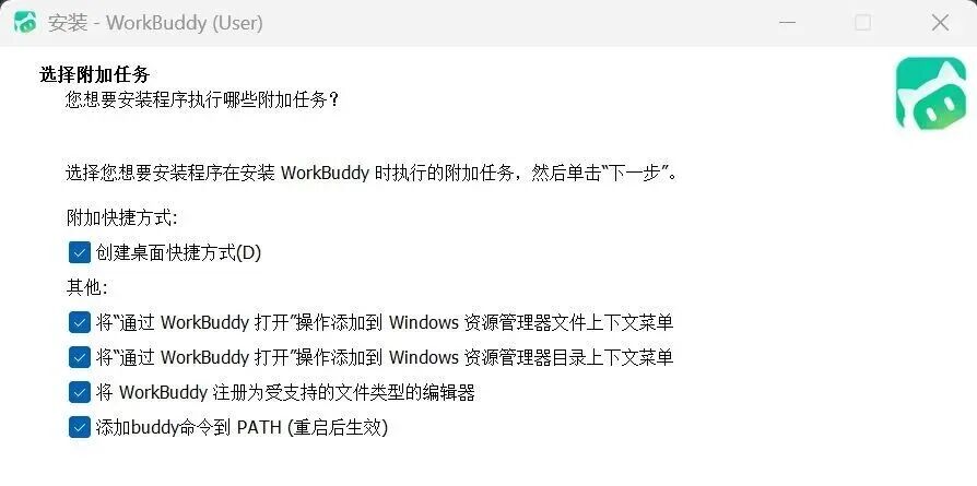默认情况下只会勾选后面两个选项,但如果你全选了,之后在资源管理器里右键点击文件时,就可以直接选择用 WorkBuddy 打开,会方便全多。当然不勾选也没问题,只是少了这个快捷入口。