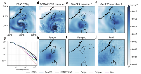 图2:台风"杜苏芮"7天预报(2023年7月21日00UTC初始)。 (c-f)700 hPa比湿场,包括ERA5验证、ECMWF-ENS成员和GenEPS成员;(g)功率谱分析;(h-j)Pangu、Fengwu和Fuxi的确定性预报场。