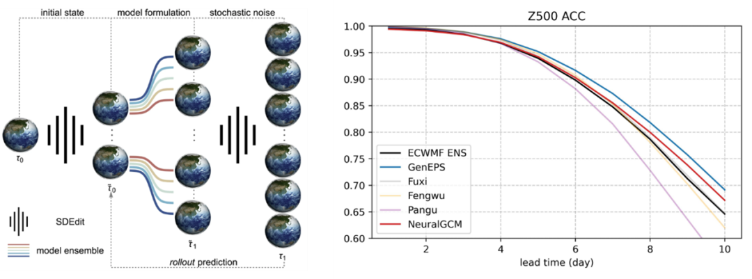 图1 左图:GenEPS算法概念图;右图:2023年全球Z500 ACC多模式性能比较