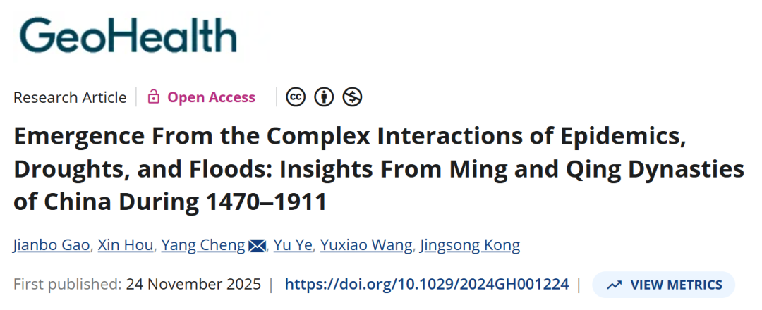 Gao, J., Hou, X., Cheng, Y., Ye, Y., Wang, Y., & Kong, J. (2025). Emergence from the complex interactions of epidemics, droughts, and floods: Insights from Ming and Qing dynasties of China during 1470–1911. GeoHealth, 9, e2024GH001224.