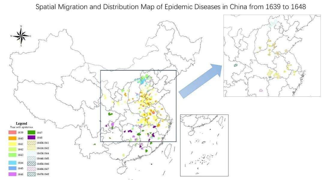 图2:1639–1648 年间中国疫情的空间分布:不同颜色标示各年份出现疫情的县份;右上角小图则汇总标示所有年份曾有疫情的县份。