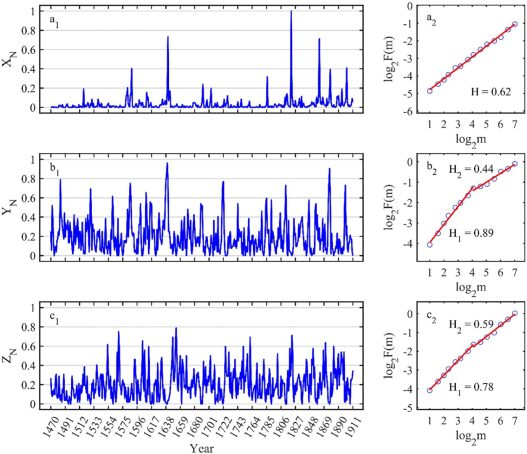 图3. (a1、b1、c1):华北地区疫情、旱灾与洪灾指数的时间序列;(a2、b2、c2) 分别为其对应的自适应分形分析(AFA)结果,图中拟合直线的斜率即为 Hurst 参数。