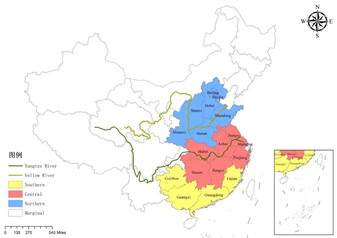图1:本研究区地图划分为三个部分:华南(含广西、广东、贵州、福建)、华中(含湖南、江西、浙江、湖北、安徽、江苏、上海)以及华北(含陕西、河南、山东、山西、河北、北京、天津)