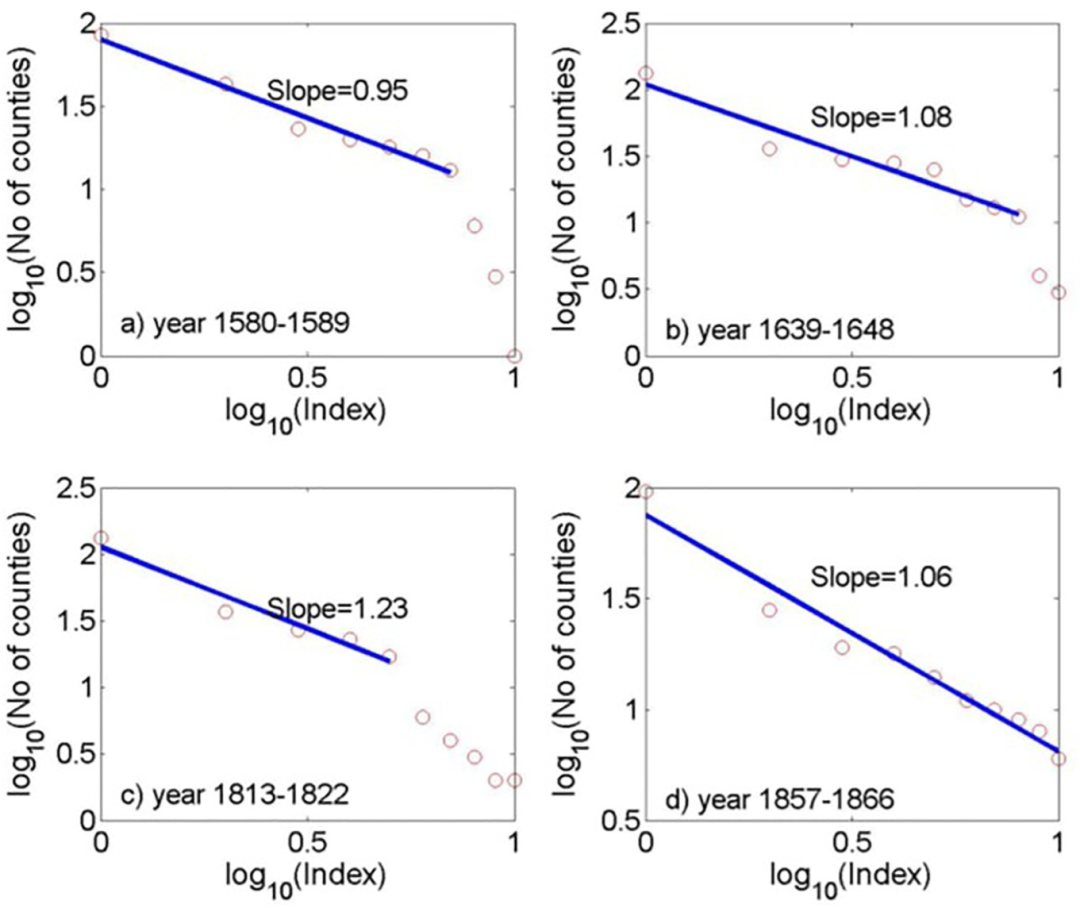 研究还发现了一个有趣的现象:历史上大规模流行病的规模分布(按受灾县数排名)在双对数坐标下呈现出完美的线性关系,即符合齐普夫定律。这表明流行病的传播并非完全随机,而是遵循着复杂系统中常见的幂律分布,这一特征在北方地区尤为明显。