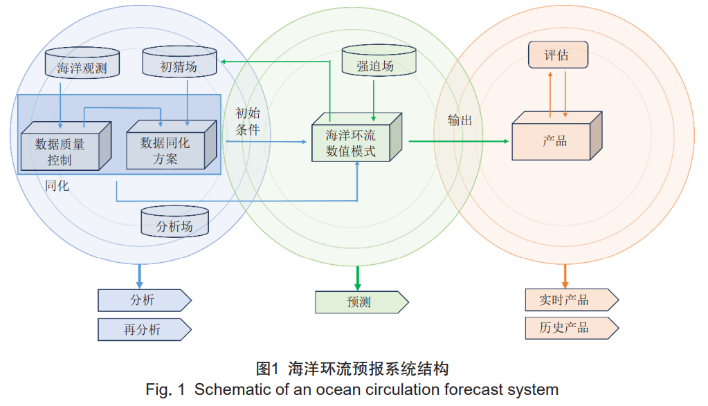 海洋环流模式和数据同化技术是海洋环流预报系统的重要组成部分。如图 1 所示,第一步是通过同化技术将观测与模式信息合理结合,产生最精确的初始条件;第二步是基于同化得到的较优的初始场对未来进行预测;第三步是对输出产品进行质量评估,并根据需求生产实时或历史的海洋数据产品。