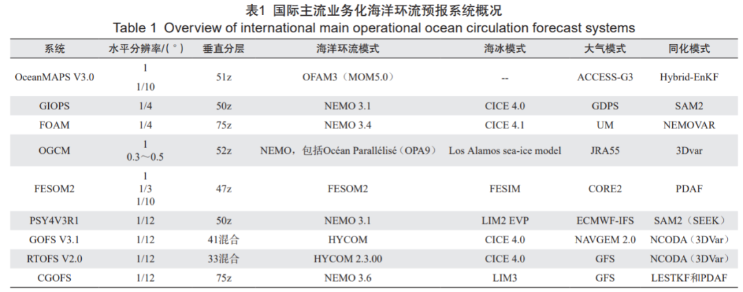 自 1958 年起,国际海洋学界逐步针对大洋环流和近海环流进行研究,发现海洋环流存在很多时空尺度的变异,这些变异对海洋沉积和海洋生态等过程极其重要。20 世纪 80 年代以来,借助海洋遥感技术可以从宏观上研究更大时空尺度的海洋环流现象,在一定程度上提升了海洋观测的时空覆盖能力。随着海洋研究进一步深入,人们发现在全球许多中长期变化中,海洋环流都发挥着重要作用,例如对气候的重要影响,从而开展了对海洋环流季节、年际甚至年代际变化的研究。海洋环流模式初期以理论模型和二维模型为主,20 世纪 70 年代中期出现三维海洋温、盐、流数值模拟的研究。随着海洋观测类型的增多、观测技术的提升,以及计算机技术的发展,国际上发布了众多不同坐标系、不同离散计算方案的全球海洋环流模式和区域海洋环流模式,这些模式在海洋环流、潮汐、泥沙堆积、海洋生态等方面的研究中被广泛应用 [11]。许多国家或地区发展的大气和海洋业务化系统都在不断进步和完善(表 2)[2-13]。