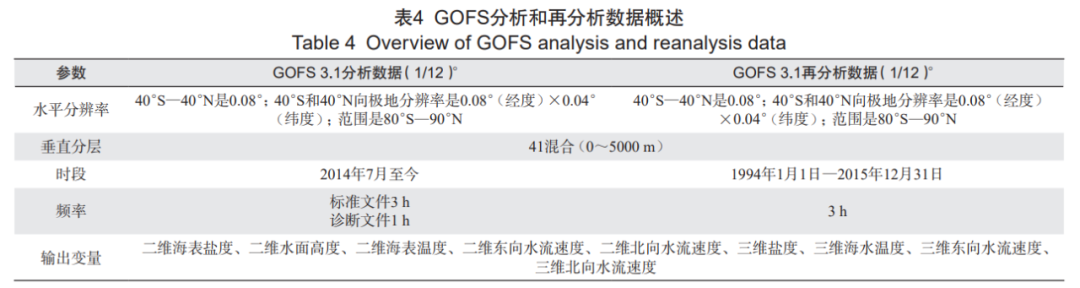 美国海军研究实验室(NRL)基于 HYCOM 模式和海军耦合海洋数据同化系统(NCODA)开发了全球海洋预报系统 GOFS 3.1,该系统能够同化卫星观测、浮标观测海表温度和海面高度以及观测温、盐廓线数据。相比于 GOFS 3.0,GOFS 3.1 的垂直方向由 32 层增加至 41 层,新增的 9 层都位于海表附近。GOFS 不仅包括全球海洋模式和大西洋区域海洋模式,还包括太平洋和印度洋区域海洋模式,区域模式分辨率为(1/25)°(赤道地区分辨率约为 9 km,中纬度地区分辨率约为 7 km,两极地区分辨率约为 3.5 km)。GOFS 目前业务化运行的预报系统 GOFS 3.1 是基于 HYCOM2.2.99DH 模式开发的 [32]。海水热力学方程(TEOS-10)主要用于解析混合层,GOFS 3.1 使用 17 项有理函数来近似该方程 [33]。GOFS 的分析变量包括温度、盐度、水位、流速矢量。GOFS 系统目前主要发布了两种数据(表 4)。