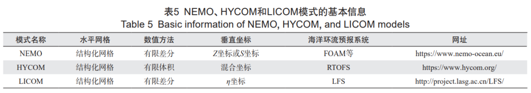 表 5 中总结了 NEMO、HYCOM 和 LICOM 模式的信息。NEMO 和 HYCOM 经过多年的发展和完善,业务化程度更高,目前已被广泛应用,结合成熟的同化系统,构建了如 FOAM、GOFS、RTOFS 等海洋环流预报系统。中国自主研发的 LICOM 经过三代更新,模拟效果逐步提升,结合 EnOI 同化方法研制的数据集也广泛应用于海洋科学研究中 [9, 60]。尽管基于各海洋模式建立的海洋环流数值预报系统都在不断完善和发展,但海洋次中尺度过程,包括次中尺度涡旋、锋面和涡丝等多尺度海洋动力学中的重要过程,由于计算能力的限制,进一步提高其预报分辨率将带来巨大的计算资源消耗。另外,目前业务中使用的海洋数据同化系统通常使用 3DVar 或 EnKF 同化技术,这两种方法都不能以同化窗口的形式同时同化多个时刻的观测资料,而 4DVar 同化技术已经在 NWP 中应用多年,因此在海洋数据同化领域需要同化算法的进一步升级。